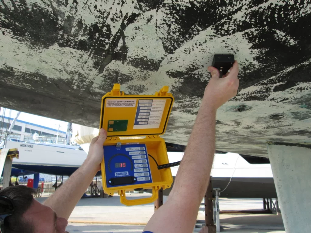 We use a Sovereign Quantum Marine Moisture Meter which is the most advanced meter on the market and which is specifically designed for the taking of moisture readings on GRP laminates. The UK company Sovereign Chemicals has a history with yacht surveyors and boatyard osmosis technicians.